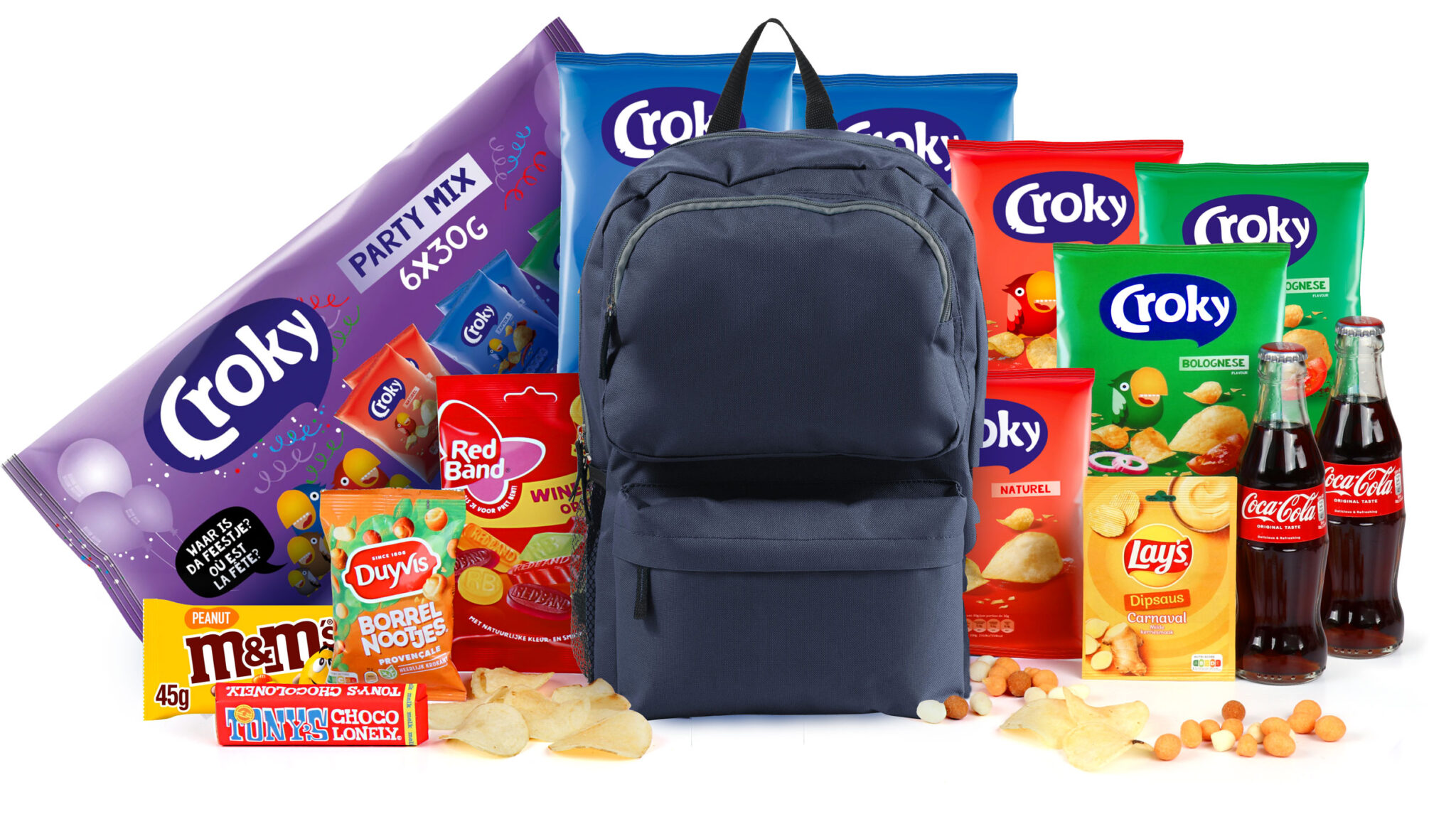 De trendy rugtas bevat alles wat jongeren lekker vinden. Twee flesjes Coca Cola van 20 cl zorgen voor verfrissing, terwijl de Tony’s Chocolonely melkchocolade van 50 gram voor zoete momenten zorgt. Voor de hartige trek zijn er Duyvis borrelnootjes van 45 gram en een uitgebreide Croky partymix met zes zakjes van 30 gram elk. De Lay’s mix voor dipsaus voegt extra smaak toe aan snackmomenten.