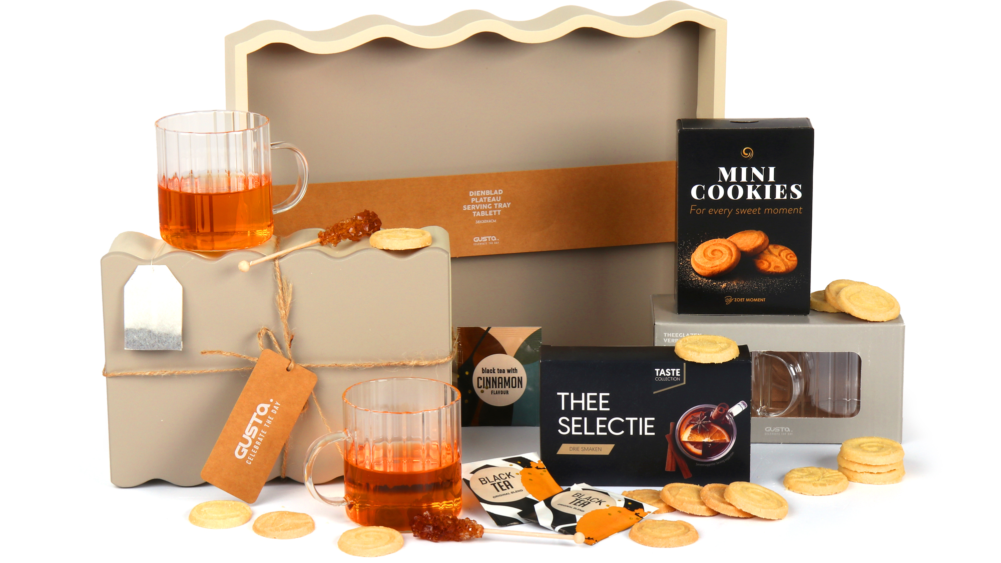 Drie zorgvuldig geselecteerde theesmaken bieden variatie voor elke smaak en stemming. De vanillekoekjes van 50 gram en twee kandijsuiker sticks completeren de smaakbeleving en maken elk kopje thee tot een kleine verwennerij. Deze samenstelling zorgt voor wekenlang theegenot.