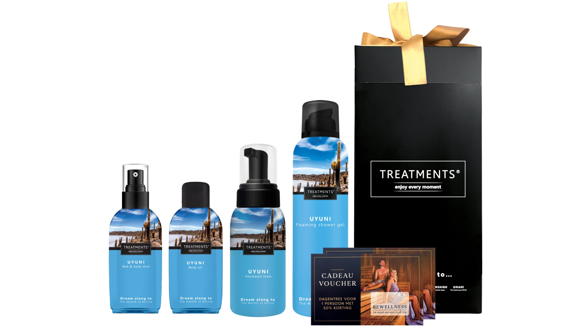 Het pakket bevat vier zorgvuldig samengestelde producten die samen een volledige wellness-ervaring creëren. De Uyuni Foaming Shower Gel van 200 ml zorgt voor een zachte reiniging, terwijl de Handwash Foam van 250 ml je handen hygiënisch en zacht houdt. Voor extra ontspanning zorgt de Bed & Body Mist van 50 ml, die een rustgevende geur verspreidt. Het Uyuni Body Oil van 50 ml voedt je huid intensief en geeft een zijdezachte finish.