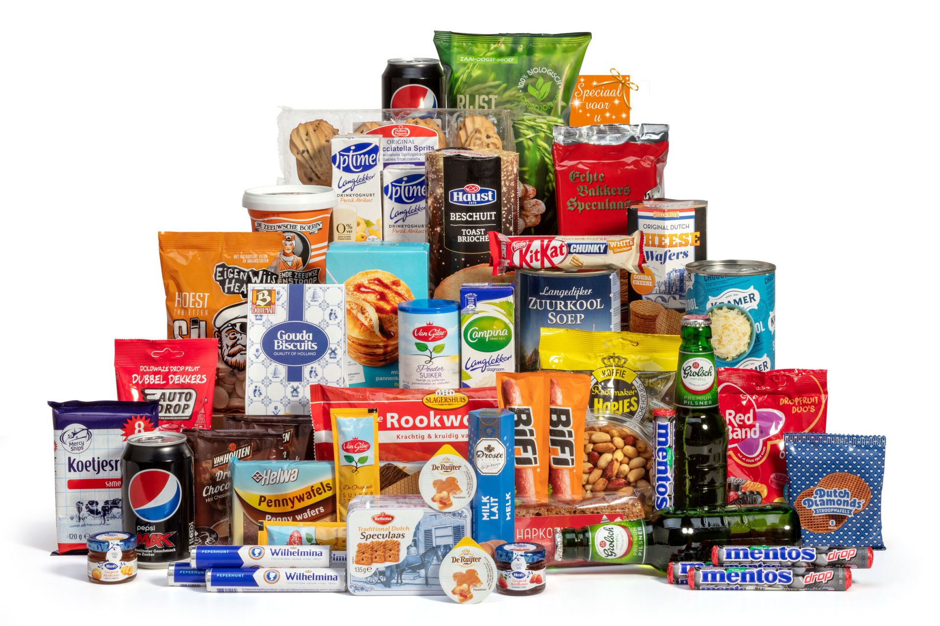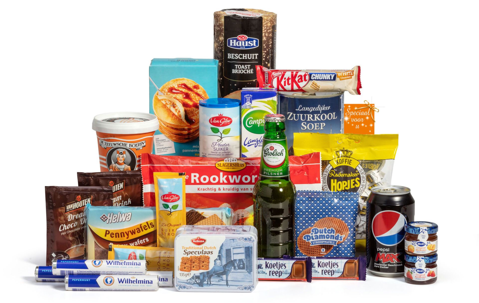 Dit pakket gaat verder dan alleen lekkers. Je krijgt een Gelderse rookworst van Slagershuis en Langedijker zuurkoolsoep voor een volwaardige Nederlandse maaltijd. De Wilhelmina pepermunt en Helwa pennywafels maken het assortiment compleet. Voor de warme dranken zorgen Van Houten chocolademelk sachets.
