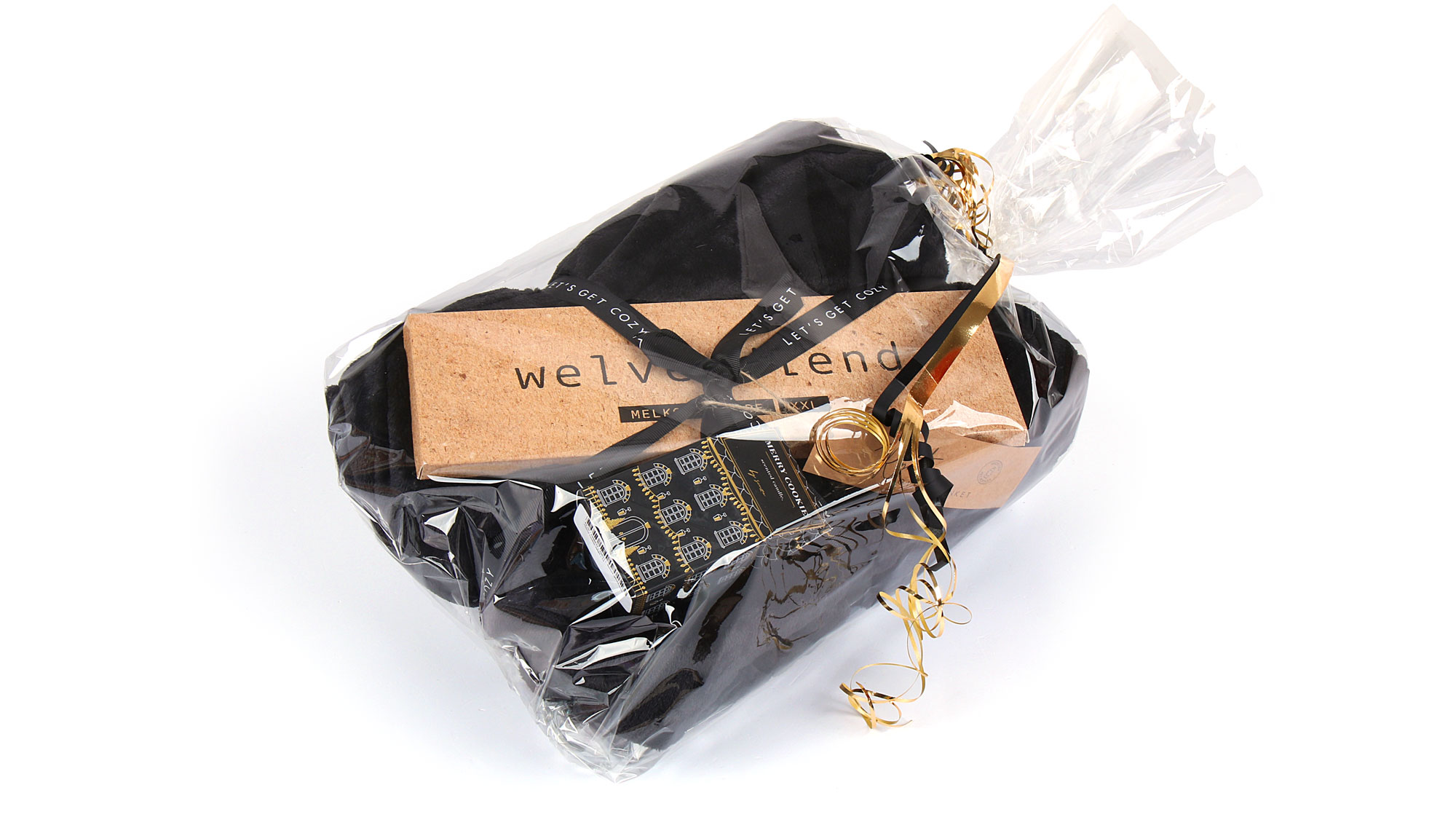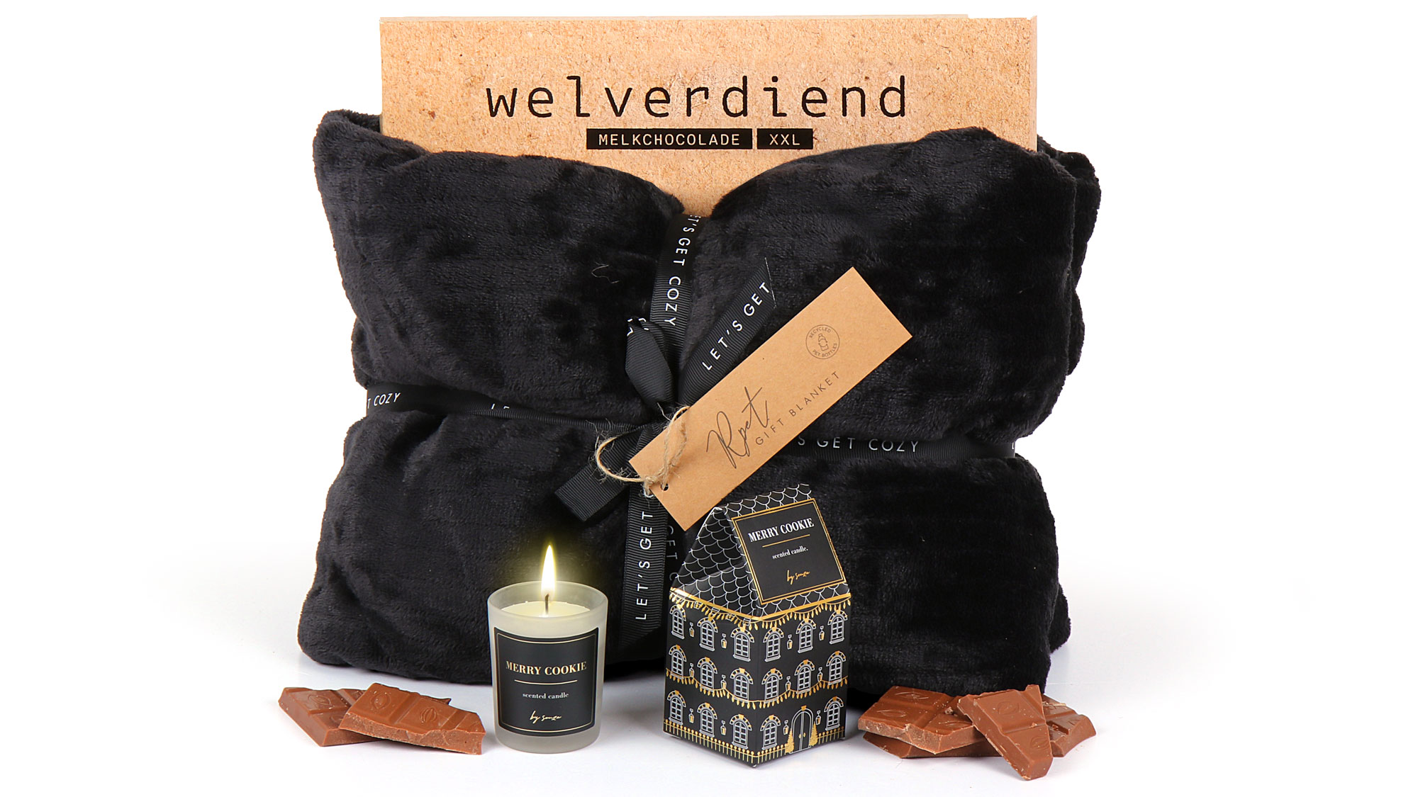 De zwarte plaid is niet alleen stijlvol maar ook milieuvriendelijk door het gebruik van gerecycled materiaal. De geurkaars zorgt voor een feestelijke sfeer en de XXL chocoladereep biedt langdurig genietplezier. Alles wordt feestelijk verpakt in folie, waardoor het direct cadeau-klaar is.