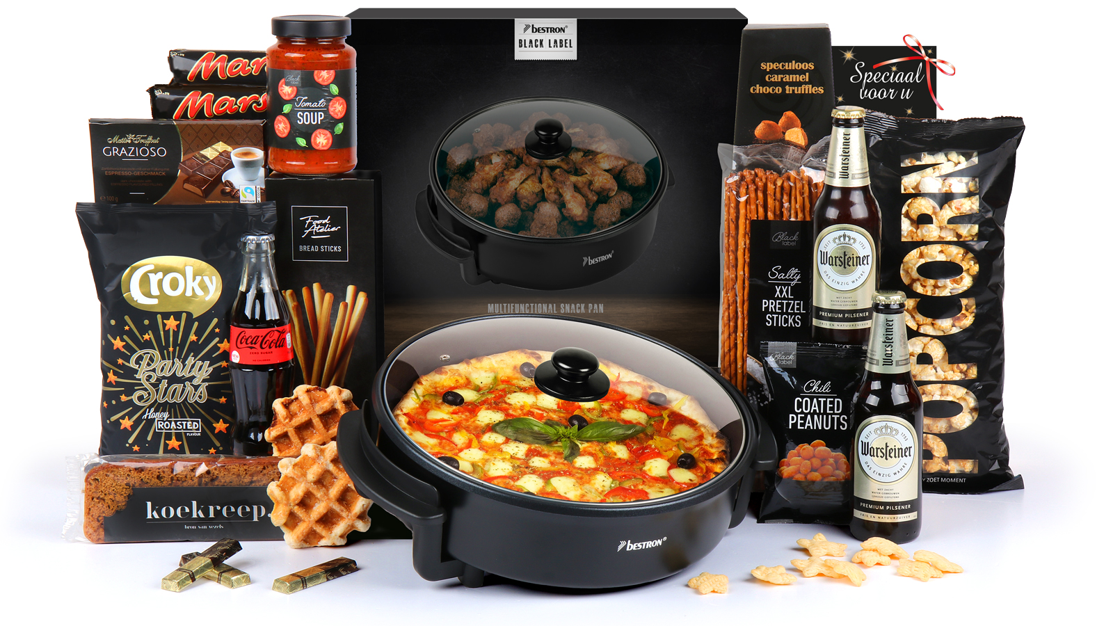Naast de hapjespan zit het pakket vol met lekkernijen die de culinaire ervaring compleet maken. Van Warsteiner bier en Coca Cola Zero voor de dorst, tot Mars repen en Grazioso pure chocolade voor de zoetekauw. De hartige kant wordt gedekt door Croky Party Stars chips, grissini broodstengels, pretzel sticks XXL, borrelnoten en popcorn. Voor de warme momenten zorgt een heerlijke tomatensoep van 450 ml.