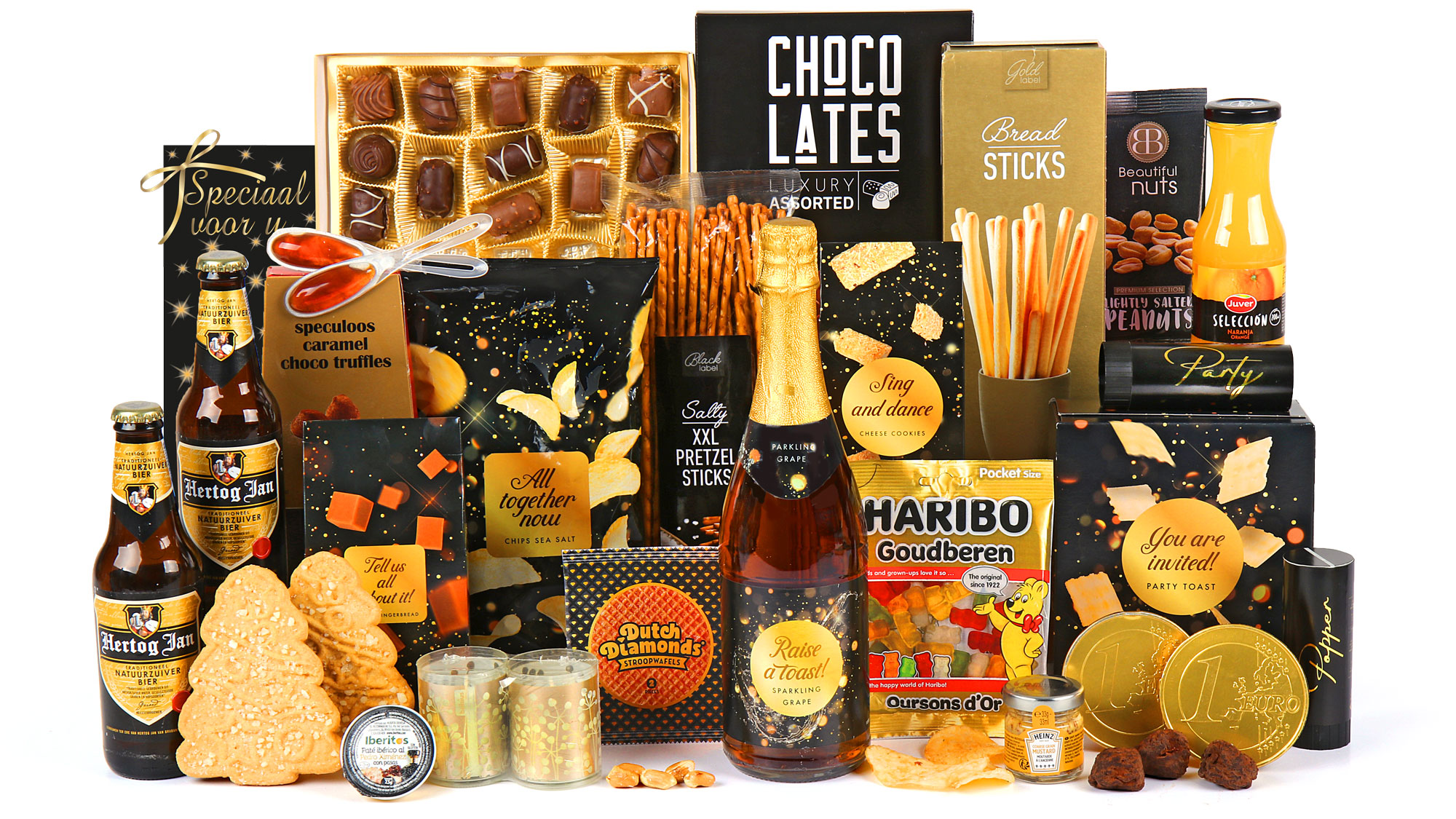 Dit pakket verwent je met luxe chocolates de luxe van 180 gram en verfijnde truffels met speculoos karamel. De All Together Now fudge speculaas en Dutch diamonds stroopwafels zorgen voor authentieke Nederlandse smaken. Voor de hartige momenten vind je Iberian paté pedro ximénez, knapperige kaaskoekjes en gezouten pinda’s. De gouden munten van 21,5 gram per stuk geven het pakket een exclusief tintje.