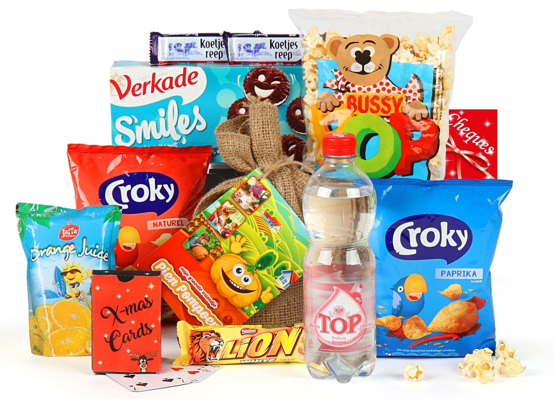 Het hart van dit pakket vormen de klassieke spelletjes met een set speelkaarten voor gezellige momenten. Voor de dorst zorgen Top water rood en vitaminenrijke Jaffa multivitamine. De smaakpapillen komen aan hun trekken met Croky chips in zowel paprika- als naturelsmaak, knapperige Bussy popcorn en de populaire Verkade koek smiles.