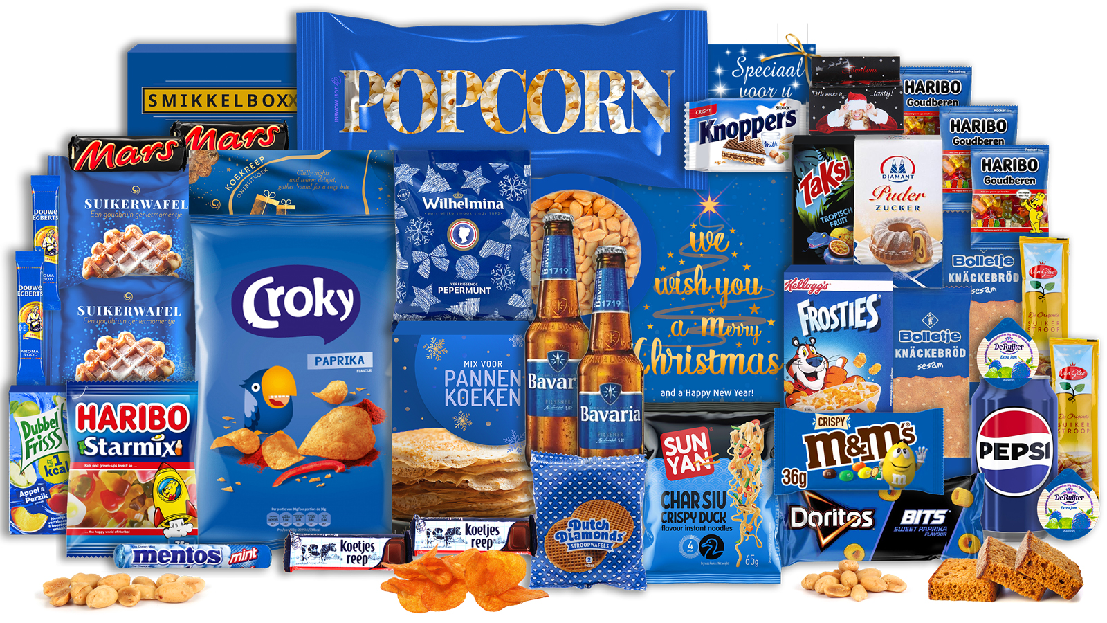 Dit kerstpakket bevat een zorgvuldig samengestelde mix van bekende merken. Van Bavaria bier en Pepsi cola voor de dorstlessers tot Haribo snoep en Mars repen voor de zoetekauw. De Croky paprika chips en verse popcorn zorgen voor gezellige filmavonden, terwijl de Douwe Egberts oploskoffie perfecte koffiemomenten garandeert. Bijzonder zijn de Dutch Diamonds stroopwafels en de pannenkoekenmix voor een ontspannen weekendochtend.