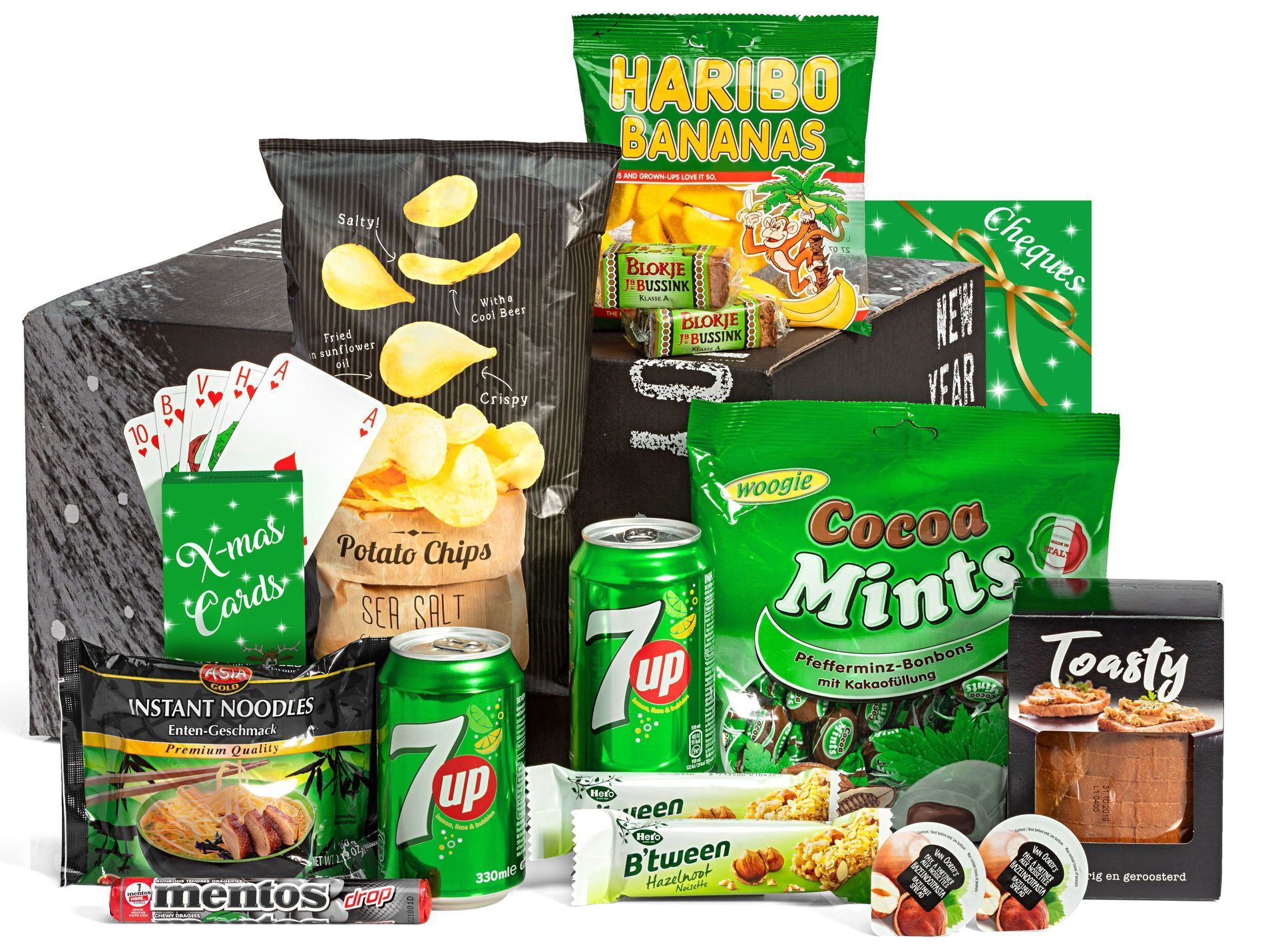 Het pakket start met klassiek entertainment door speelkaarten voor gezellige avonden. Voor de dorst zorgen twee Seven Up blikjes van 330 ml, terwijl de zoetjes variëren van Haribo bananen tot pepermuntsnoepjes met cacaovulling. De hartige trek wordt gestild met kip halal noodles en sea salt chips.